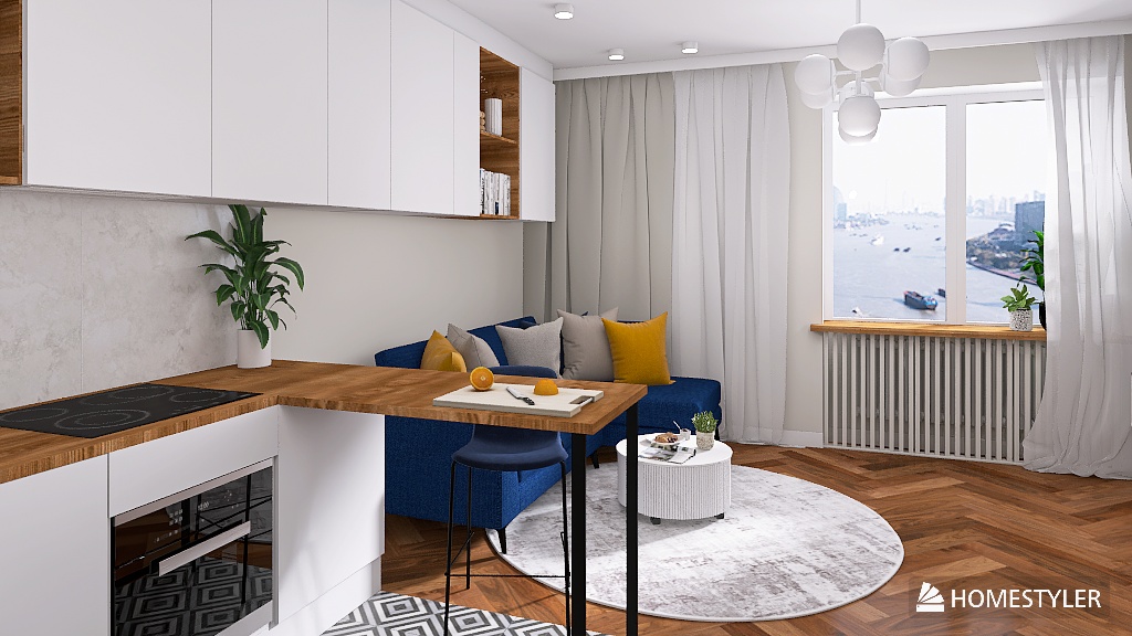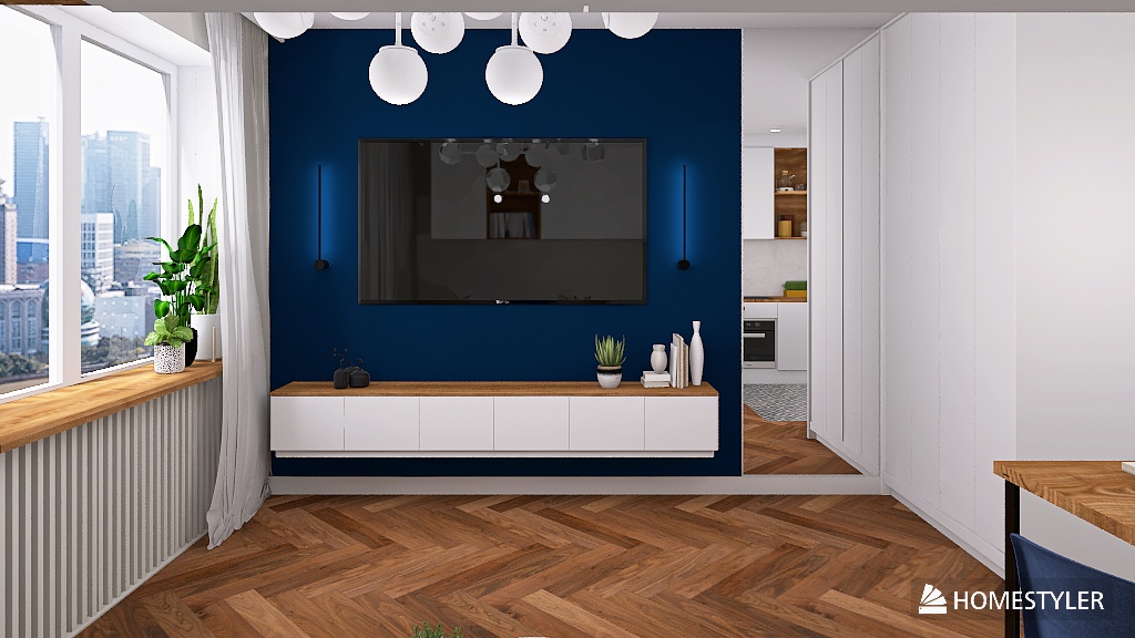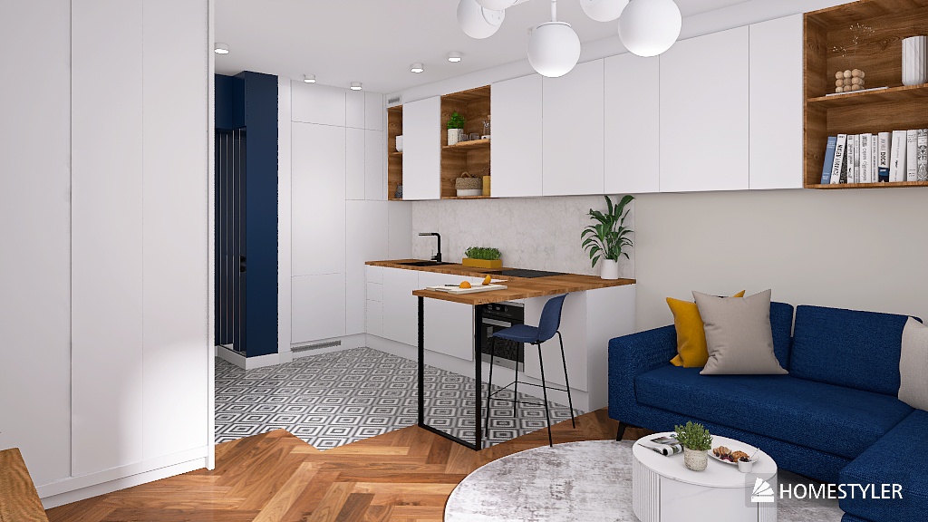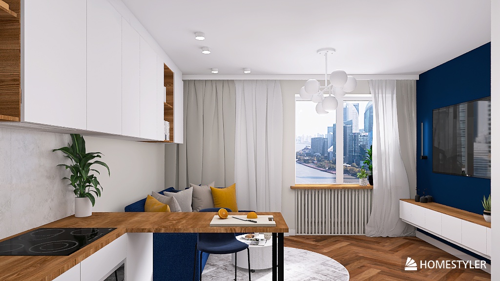 Kolor, materiał i światło współpracują ze sobą, tworząc przestrzeń czytelną i wygodną na co dzień. To kawalerka, która mimo niewielkiego metrażu daje poczucie ładu, funkcji i oddechu – prosta, uporządkowana i gotowa do życia.