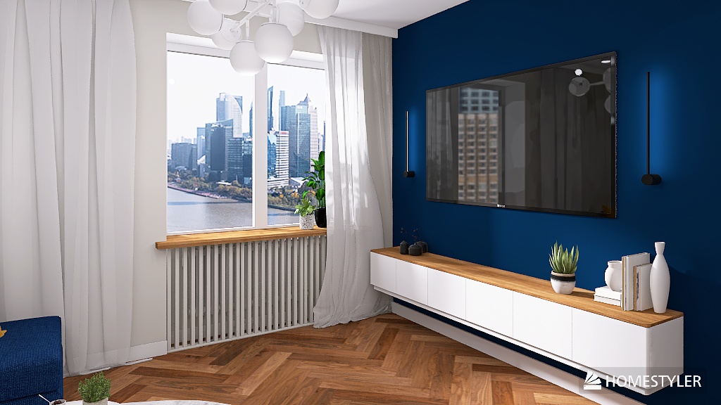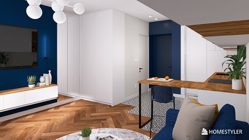 Strefa wypoczynku pełni jednocześnie funkcję sypialni – sofa tworzy miejsce do odpoczynku w ciągu dnia i komfortową przestrzeń snu wieczorem. Granatowa ściana buduje głębię i wizualne zakotwiczenie wnętrza, a miękkie tkaniny i okrągły dywan łagodzą geometrię przestrzeni, wprowadzając równowagę.