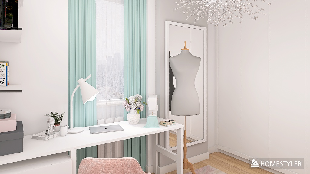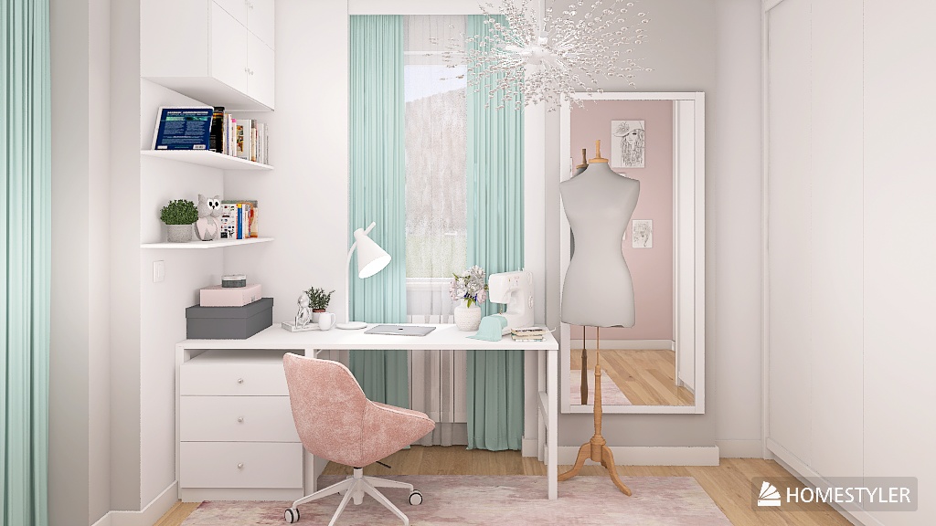 Dominują tu biel, delikatna szarość, pastelowy róż i morski, które tworzą jasną, spokojną i inspirującą atmosferę 🤍🌿 Biurko ustawione przy oknie zapewnia naturalne światło i wygodne miejsce do nauki, pracy twórczej i rozwijania pasji 📚✏️ Dzięki prostemu, ponadczasowemu układowi przestrzeń pozostaje uporządkowana i funkcjonalna.