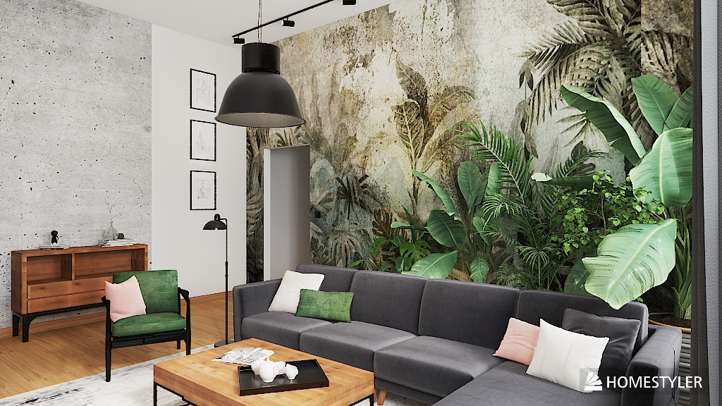 Centralnym punktem salonu jest tapeta z motywem dżungli za grafitową sofą – mocna, organiczna, przyciągająca wzrok. To miejsce, w którym natura spotyka industrial. 🍃🖤